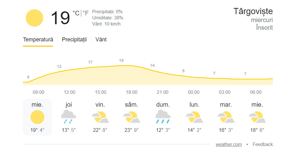 Târgoviște: 19 grade Celsius, Precipitații: 10%, Umiditate: 38%, Vânt: 8 km/h