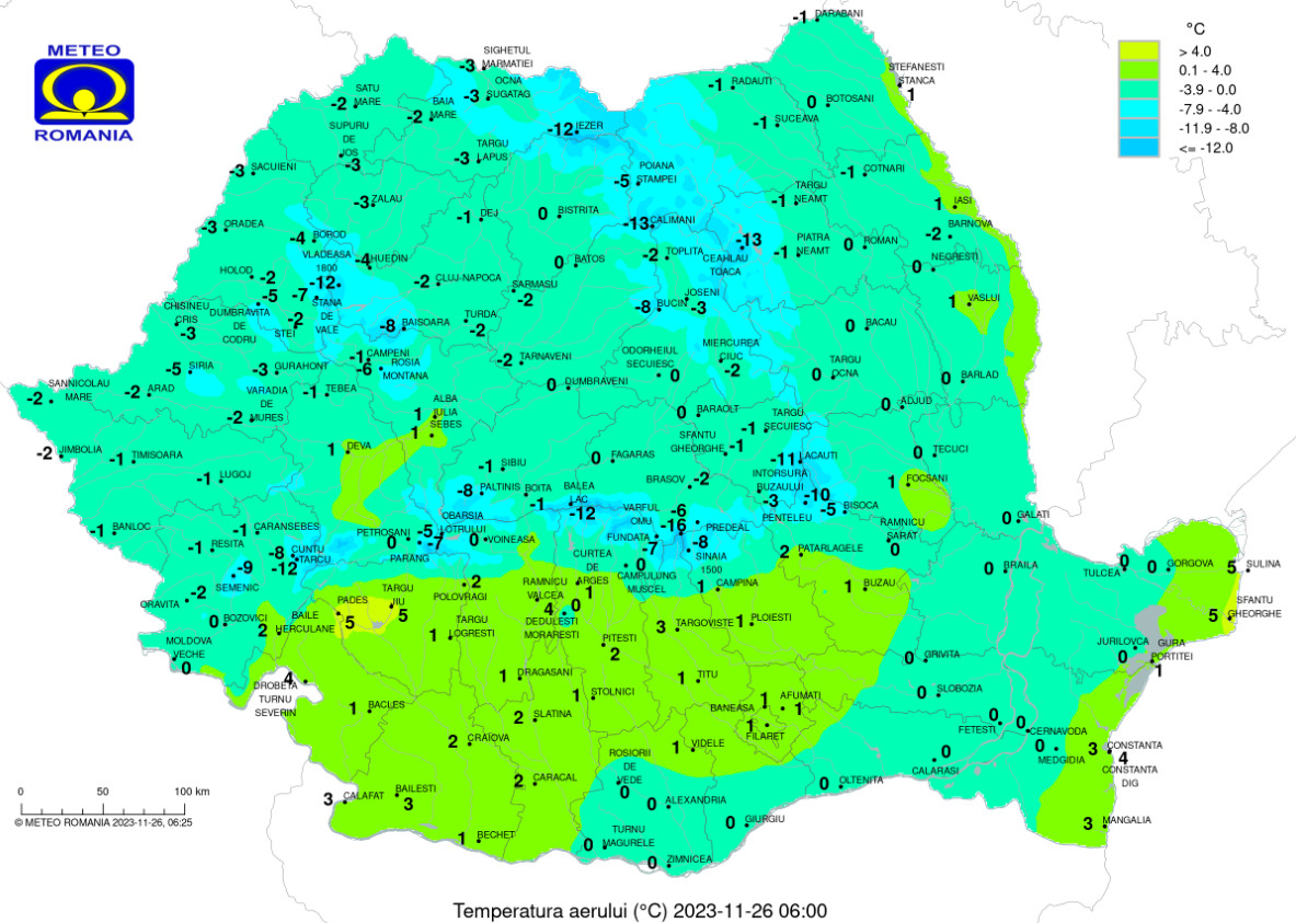 Prognoza meteo pentru duminică, 26 noiembrie 2023,vremea va fi rece și vântoasă în majoritatea zonelor,precipitațiile vor fi preponderent sub formă de ninsoare în Dobrogea, estul Munteniei și Moldova. Maximele termice se vor încadra între -3 și 6 grade Celsius.