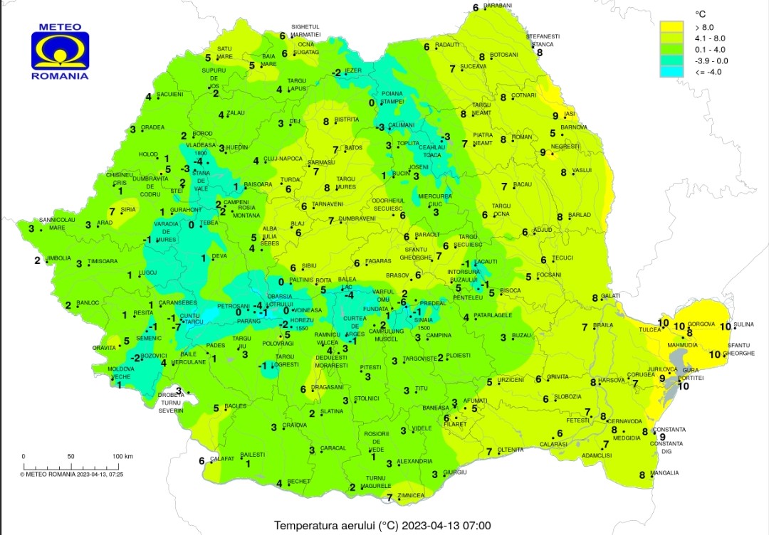 Prognoza meteo pentru joi, 13 aprilie 2023,vor fi înnorări la începutul zilei, mai ales în extremitatea de est, unde izolat va ploua slab, iar în extremitatea vestică pe alocuri vor fi averse cu posibile descărcări electrice.