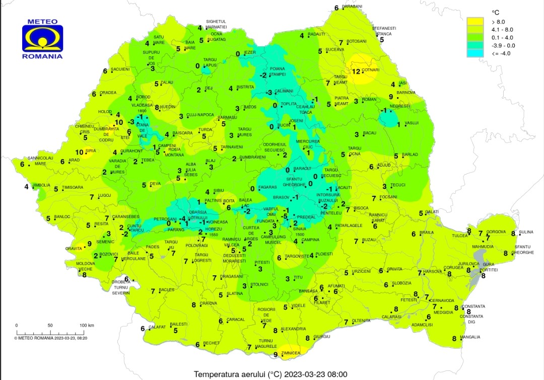 Temperaturile maxime se vor încadra între 12 şi 20 de grade, iar cele minime se vor situa între -2 grade în depresiunile din estul Transilvaniei şi 8…9 grade în dealurile vestice. Dimineaţa şi noaptea pe alocuri se va forma ceaţă.