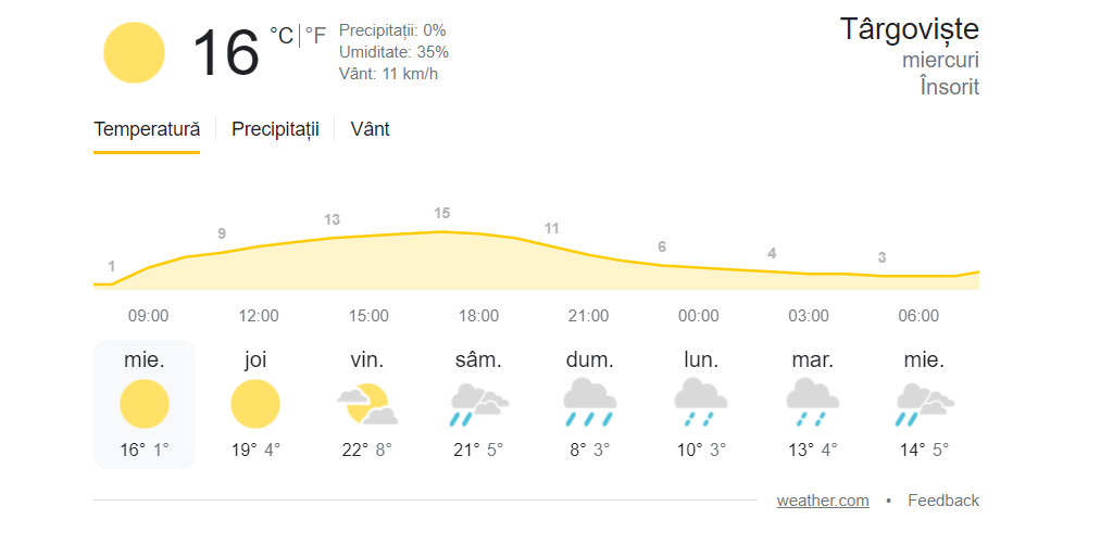 Târgoviște: 16 grade Celsius, Precipitații: 10%, Umiditate: 37%, Vânt: 11 km/h
