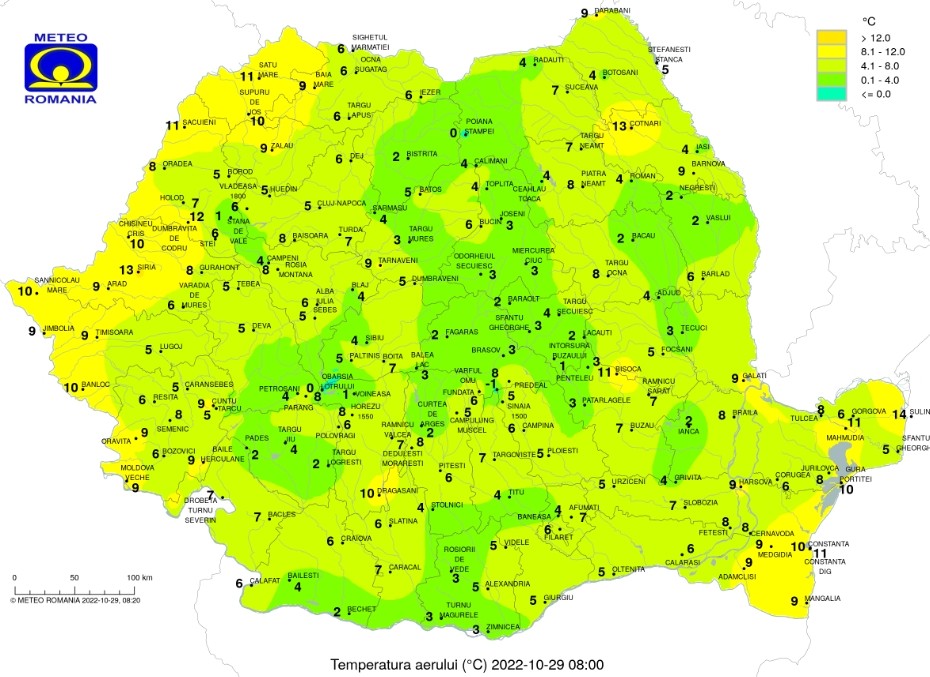 Prognoza meteo pentru sâmbătă, 29 octombrie 2022, cerul se va menține variabil, cu unele înnorări pe arii restrânse dimineața și noaptea în zonele joase din vest, nord-vest, centru și nord-est, unde există posibilitatea să burnițeze sau să plouă slab.