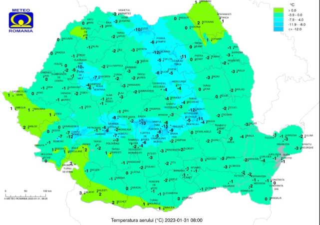Temperaturile maxime, peste cele climatologic specifice perioadei în cea mai mare parte a ţãrii, se vor încadra între 0 şi 7 grade Celsius, mai ridicate în sudul ţãrii, pânã la 8…10 grade Celsius. Minimele termice vor fi cuprinse în general între -7 şi 0 grade Celsius