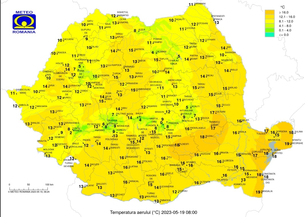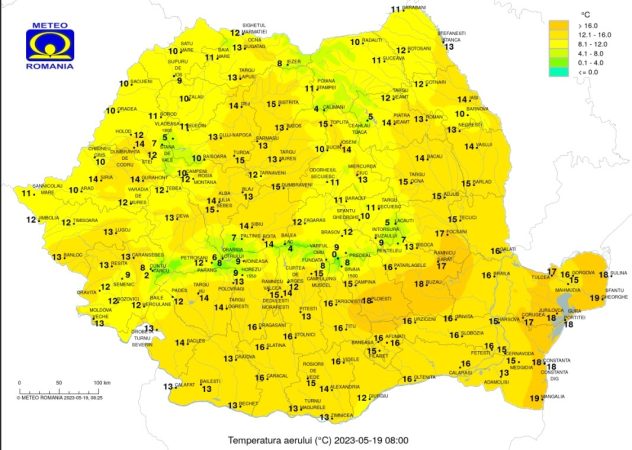 Temperaturile maxime se vor încadra între 15 și 24 de grade, iar cele minime vor fi cuprinse între 8 și 16 grade, cu valori mai scăzute în depresiunile intramontane, în special din estul Transilvaniei, până spre 5 grade.