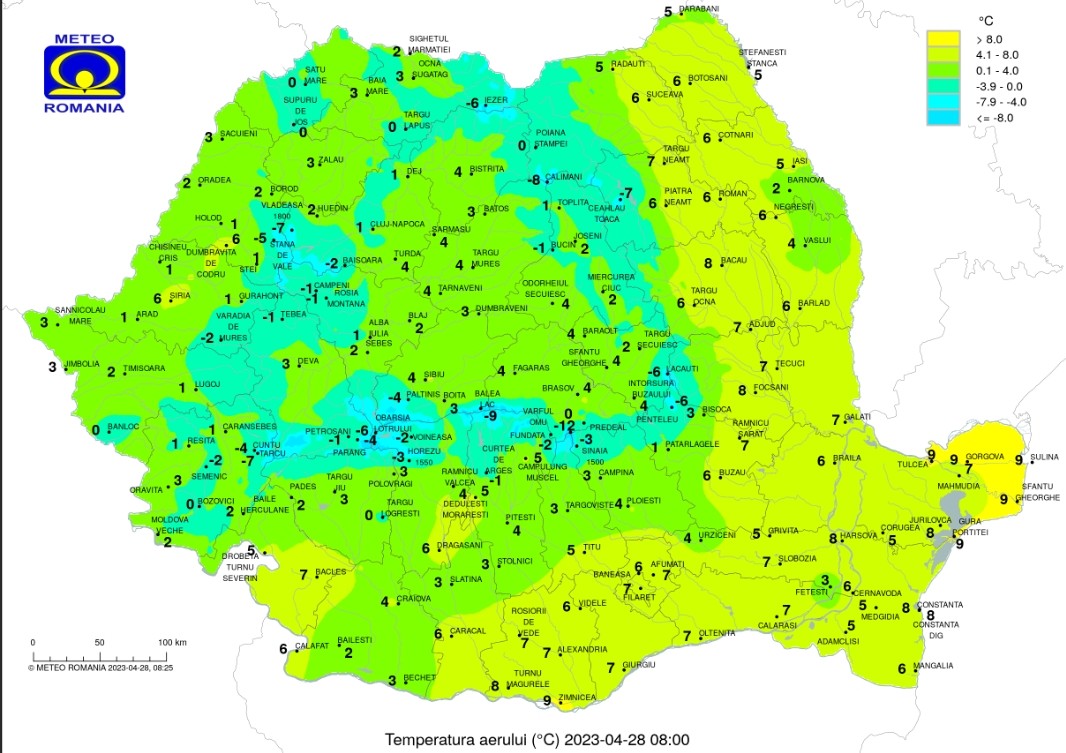 Prognoza meteo pentru vineri, 28 aprilie 2023, valorile termice se vor situa sub media acestei perioade, cu temperaturi maxime predominant între 8 și 18 grade Celsius. Minimele termice vor coborî sub pragul de îngheț, în special în depresiuni, unde vor fi -5 sau -4 grade.
