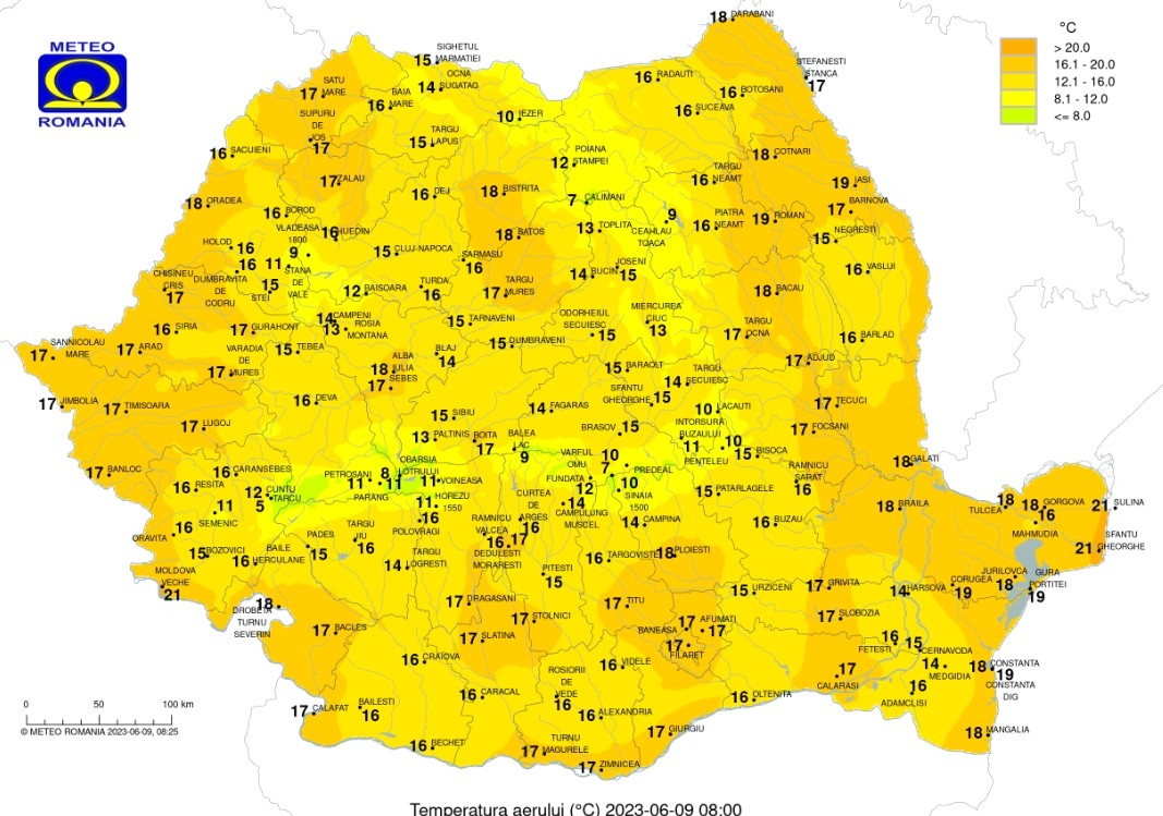 Temperaturile maxime vor caracteriza o vreme răcoroasă în regiunile vestice și nord-vestice și se vor situa în jurul normelor perioadei în celelalte zone, astfel că la nivelul întregii țări se vor încadra între 21 și 30 de grade; minimele termice vor fi cuprinse între 8…10 grade în depresiunile intramontane și 18…19 grade pe litoral.
