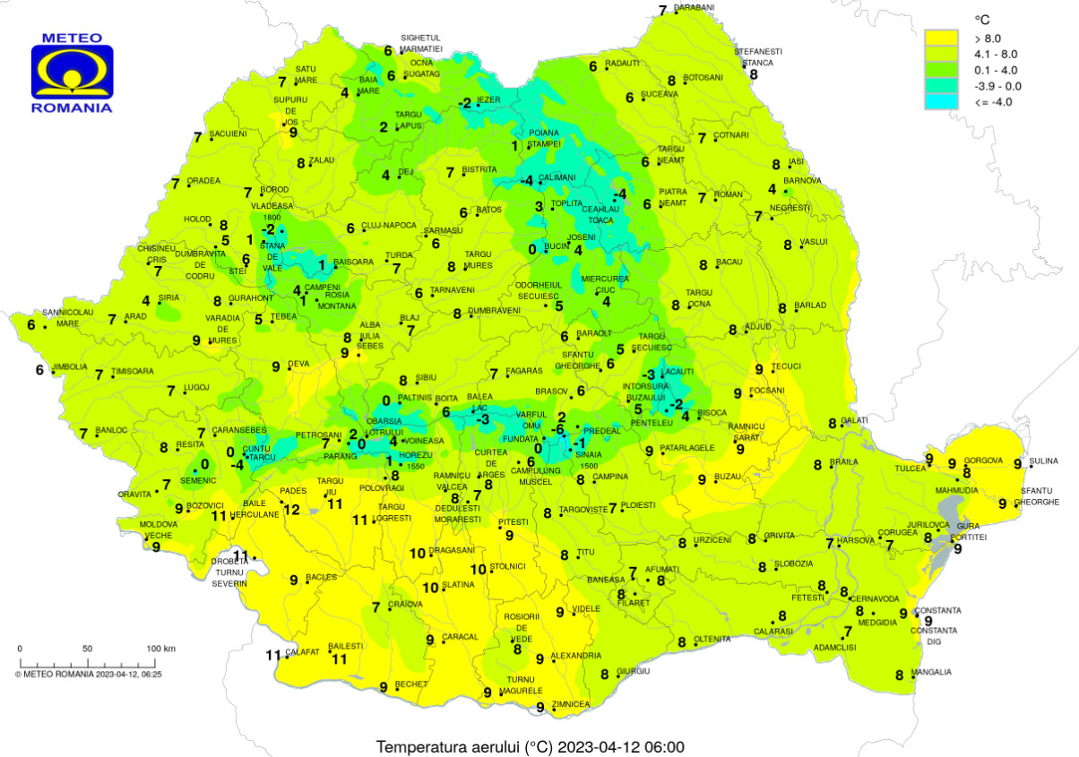 Prognoza meteo pentru ziua de 12 aprilie,vreme rece și ploioasă, la munte va ninge,temperaturile maxime nu vor trece astăzi, de 15 grade și va ploua în centru și sud-est, local în sud și est și doar pe arii restrânse în rest.
