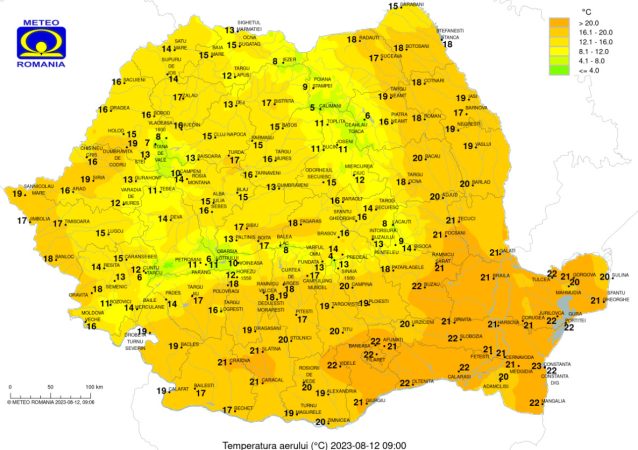 Sâmbătă, 12 august 2023,vremea se va mai răci și în anumite regiuni vor fi prezente înnorări, maximele termice se vor încadra între 26 și 32 de grade Celsius, iar cele minime între 10 și 22 de grade Celsius, cu valori mai scăzute în depresiuni.