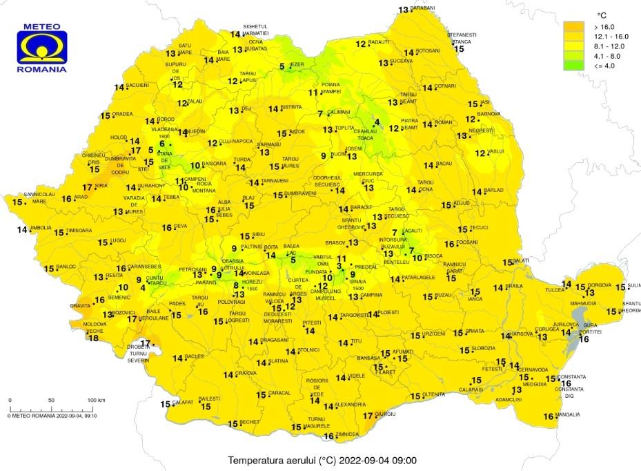 Temperaturi de toamnă, duminică, 4 septembrie, vremea va cunoaște o ușoară încălzire,  temperaturile maxime nu vor depăși 22 de grade Celsius, cu minime de până la 12- 13 grade Celsius.
