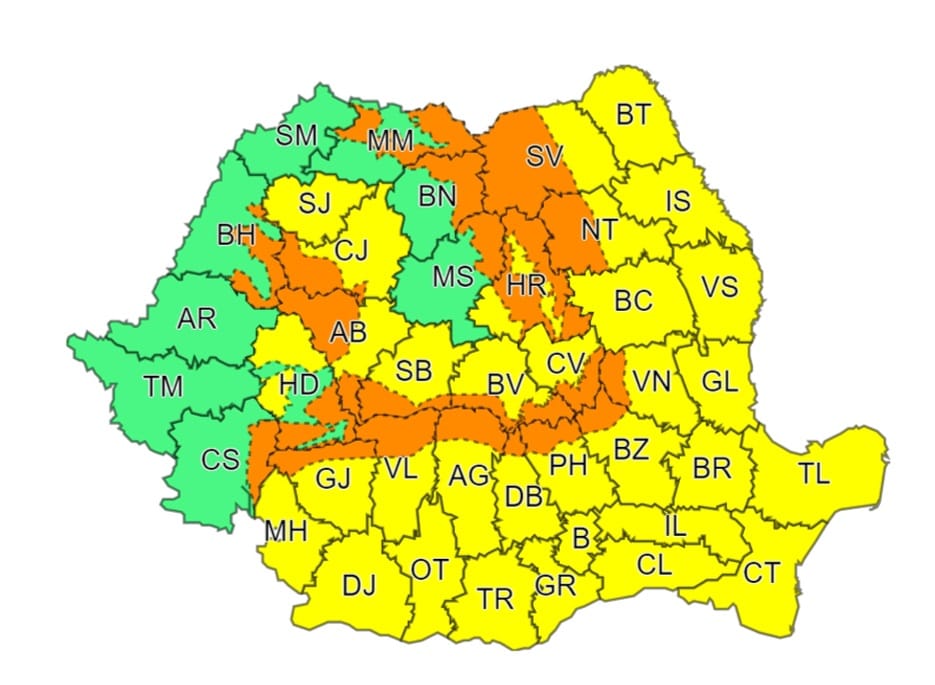 AVERTIZARE METEOROLOGICĂ 🟧 COD PORTOCALIU valabilă în intervalul 21 februarie, ora 10 – 21 februarie, ora 22, în care sunt vizate, în zona montană, la altitudini de peste 1700 m, intensificări puternice ale vântului cu rafale de peste 110…120 km/h și perioade cu viscol și vizibilitate redusă.