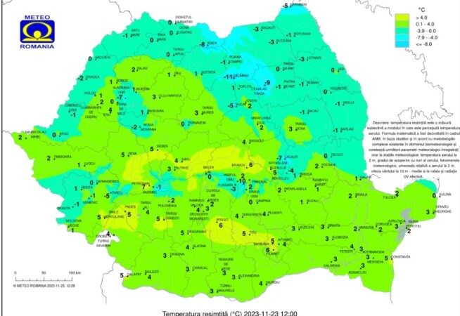 În România, masa de aer rece aduce precipitații abundente, vânt puternic și ninsori și în zonele joase.Cerul va fi mai mult noros în majoritatea regiunilor și va ploua slab în Oltenia, Muntenia și în Dobrogea și izolat în sud-vestul Transilvaniei. Cantitățile de precipitații vor depăși izolat 15 l/mp. În Carpații Meridionali, ninge. Vântul suflă slab și moderat. În această dimineață temperatura aerului avea valori cuprinse între 1 grad la Baia Mare, Satu Mare, Târgu Lăpuș și Toplița și 9 grade la Bechet și Calafat. Ceața se manifesta pe alocuri în Transilvania și nordul Moldovei.