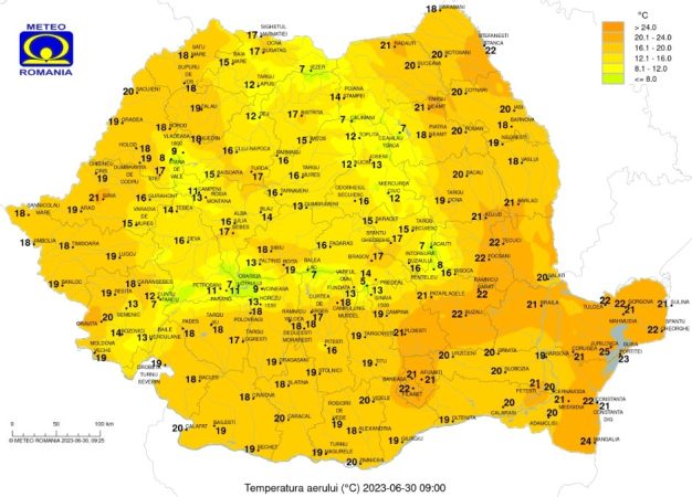 Vineri, 30 iunie 2023, vremea se va mai încălzi față de ziua anterioară, sunt așteptate averse, cerul va fi variabil, cu înnorări temporare și intensificări de scurt moment ale vântuluii.