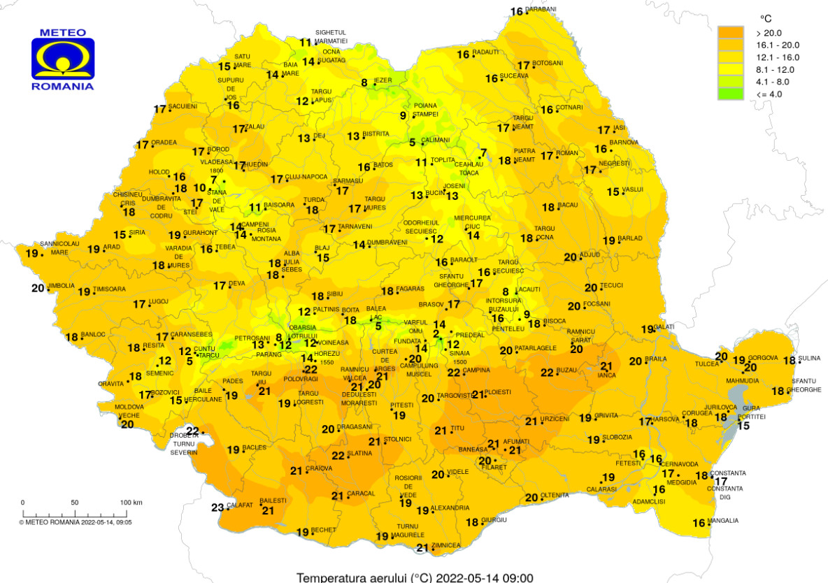 Vremea, 14 mai 2022, va fi cald afară, dar meteorologii anunță furtuni după orele prânzului, înnorări temporar accentuate, descărcări electrice, averse ce vor avea și caracter torențial și intensificări de scurtă durată ale vântului, în Muntenia, local în Dobrogea, Oltenia, la munte și izolat în Transilvania și Moldova.