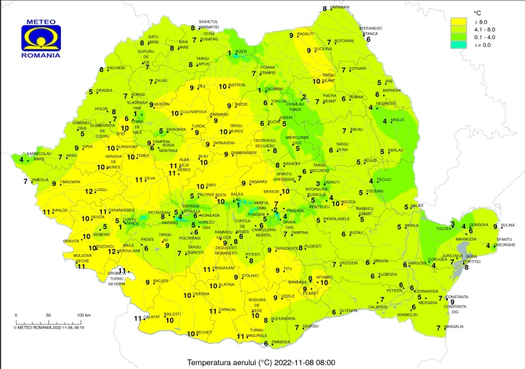 Vremea, 8 noiembrie 2022, temperaturile maxime se vor încadra în general între 12 şi 20 de grade, iar cele minime vor fi cuprinse în marea lor majoritate între 1 şi 9 grade.