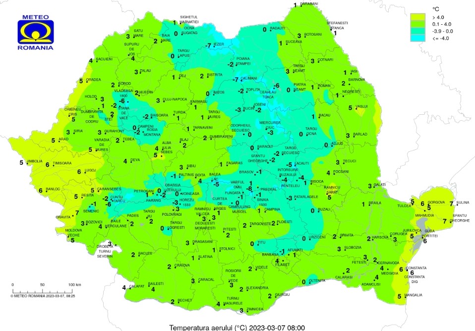 Temperaturile maxime se vor încadra în general între 7 şi 15 grade, iar cele minime vor fi cuprinse între -2 şi 7 grade. Izolat, la începutul şi sfârşitul intervalului, va fi ceaţă.
