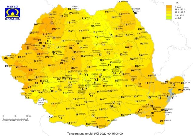 Vremea de joi, 15 septembrie 2022, potrivit ANM, va fi în general instabilă în toate zonele țării și semnificativ de caldă, temperaturile maxime se vor încadra în general între 24 și 34 de grade. Valorile minime vor fi cuprinse între 12…13 grade în depresiuni și 21…22 de grade pe litoral.