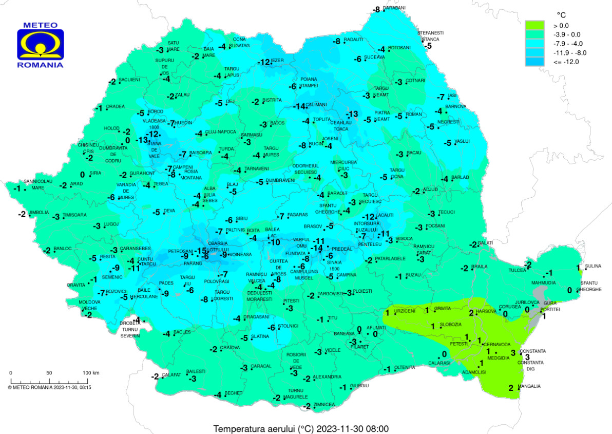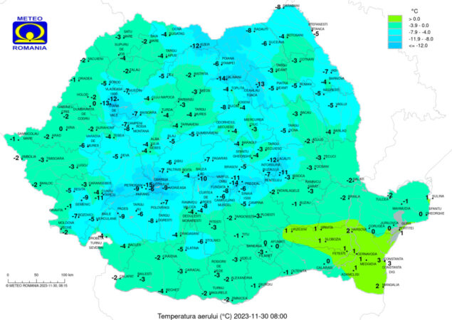 Vremea în toată țara pe 30 noiembrie 2023,noaptea dintre 29 spre 30 a fost mai rece decât cea precedentă, cu valori negative între -10 și 0 grade Celsius în toată țara.