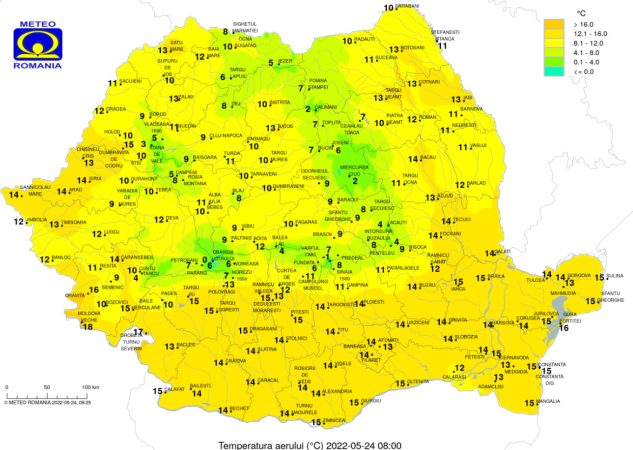 Temperaturile maxime de astăzi se vor încadra între 29 și 20 grade, pe când cele minime se vor încadra între 16 și 7 grade.