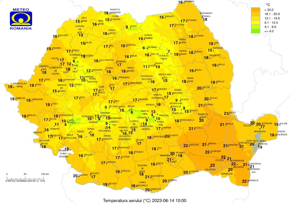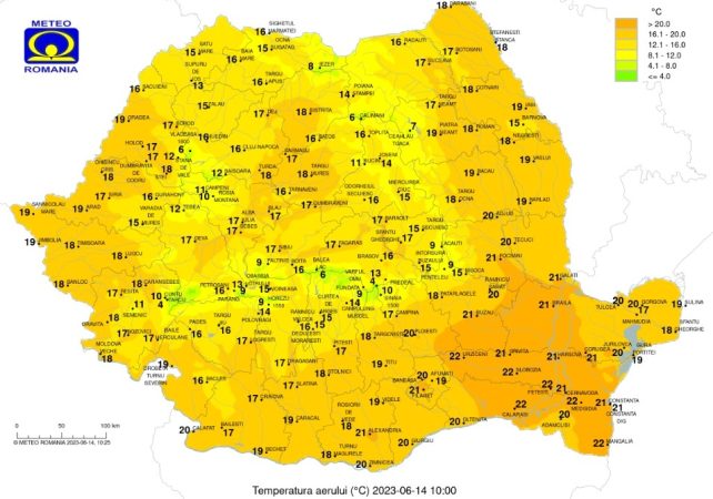 Vântul va sufla slab și moderat, cu intensificări de scurtă durată în timpul averselor. Temperaturile maxime se vor încadra între 22 și 30 de grade, iar cele minime între 9 și 20 de grade.