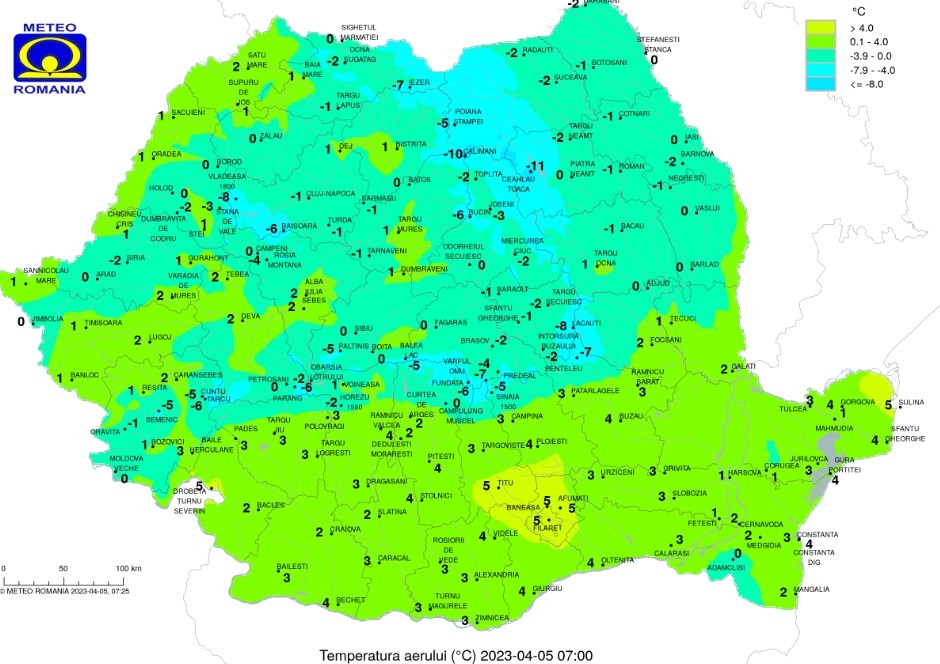 Temperaturile maxime se vor încadra între 0 şi 9 grade, uşor mai ridicate în dealurile sudice, iar cele minime vor fi cuprinse între -3 şi 4 grade
