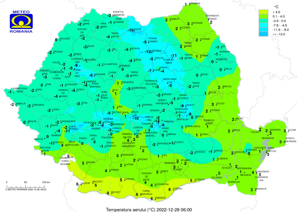 Temperaturile maxime se vor încadra între 5 şi 12 grade, iar cele minime între -3 grade în depresiunile Carpaţilor Orientali şi în Subcarpaţii Getici şi 6 grade în Dealurile de Vest.