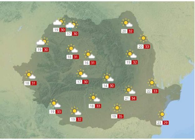 Vremea va fi călduroasă în majoritatea regiunilor, cu disconfort termic în creștere mai ales în zona de câmpie din Muntenia, sud-estul Olteniei și sudul Moldovei unde va fi caniculă; astfel, temperaturile maxime se vor încadra între 27…29 de grade pe litoral și în depresiuni și în jurul a 36 de grade în sudul Munteniei.
