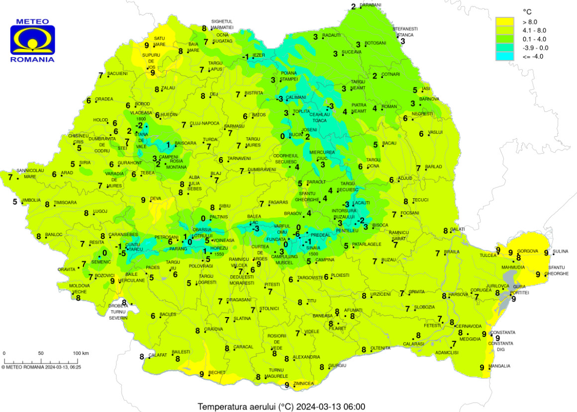 Temperaturile maxime se vor încadra în general între 8 și 14 grade, iar cele minime vor fi cuprinse în marea lor majoritate între 0 și 5 grade.