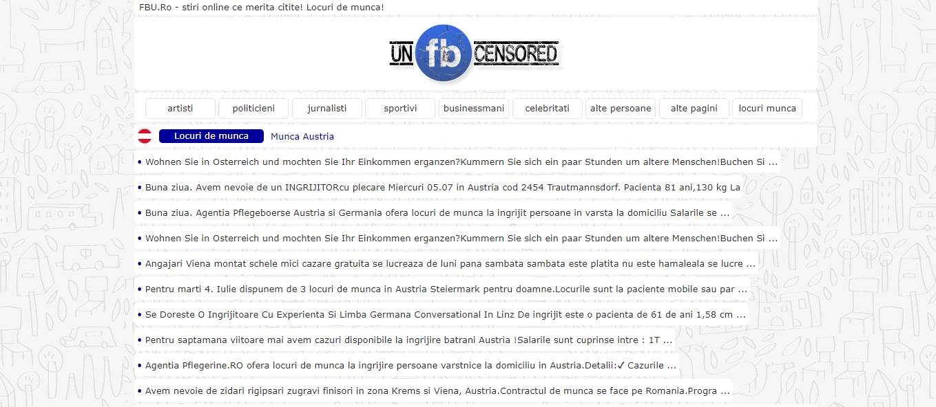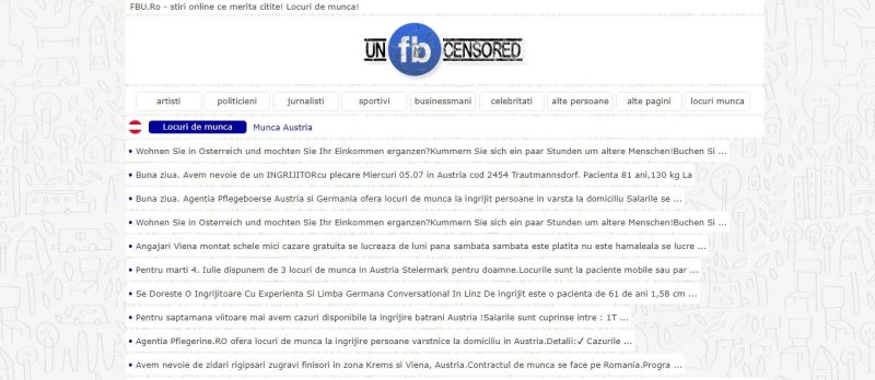 Pe www.FBU.ro puteti gasi locuri de munca in Austria cu cazare sau fara cazare, cu cazare gratuita sau platita, pentru muncitori calificati sau muncitori necalificati (mesteri, ingjirire batrani, badante, pentru curatenie / salubritate, soferi personali sau curieri, rigipsari, dulgheri, descarcat & incarcat pachete, instalatori, ajutori bucatari etc.), cu transport gratuit din Romania in Austia sau cu transport platit.