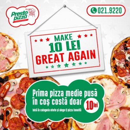 O pizza medie 10 lei este o ofertă de care merită să profiți. Dacă n-ai mai comandat până acum la Presto Pizza, atunci trebuie să beneficiezi de ofertă : comanzi prima pizza la doar 10 lei și a doua pizza medie sau grande, la preț întreg. Ai o varietate mare de sortimente de pizza, toate realizate din ingrediente alese atent, proaspete și delicioase. Iar livrarea este rapidă, direct la tine acasă, pentru ca tu să te bucuri de pizza alături de cei dragi.