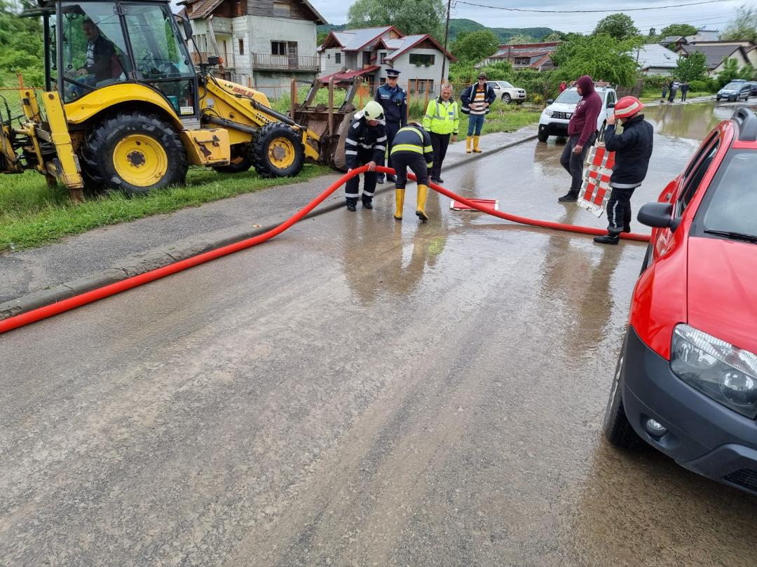 Pe DN71, la intrarea în orașul Pucioasa, se actioneaza cu o motopompă de mare capacitate pentru evacuarea apei.