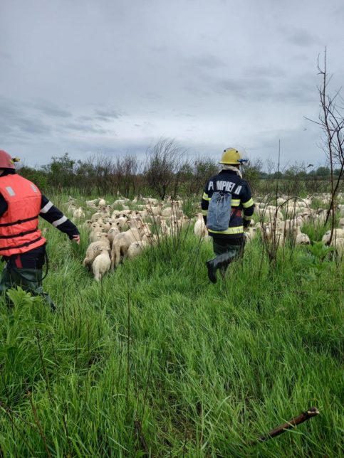 INTERVENȚIA POMPIERILOR pentru salvarea unui cioban și a 800 de oi,izolați pe un islaz înconjurat de apă, în comuna dâmbovițeană Cornești, sat Cristeasca.