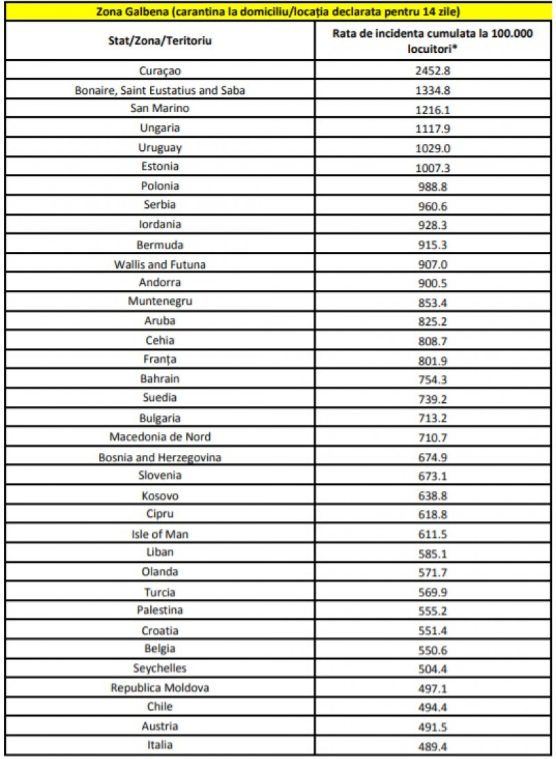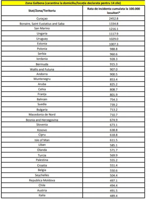 Persoanele care sosesc în România din aceste țări, regiuni sau teritorii incluse în așa-numită „zonă galbenă” trebuie să stea în carantină pentru 14 zile.