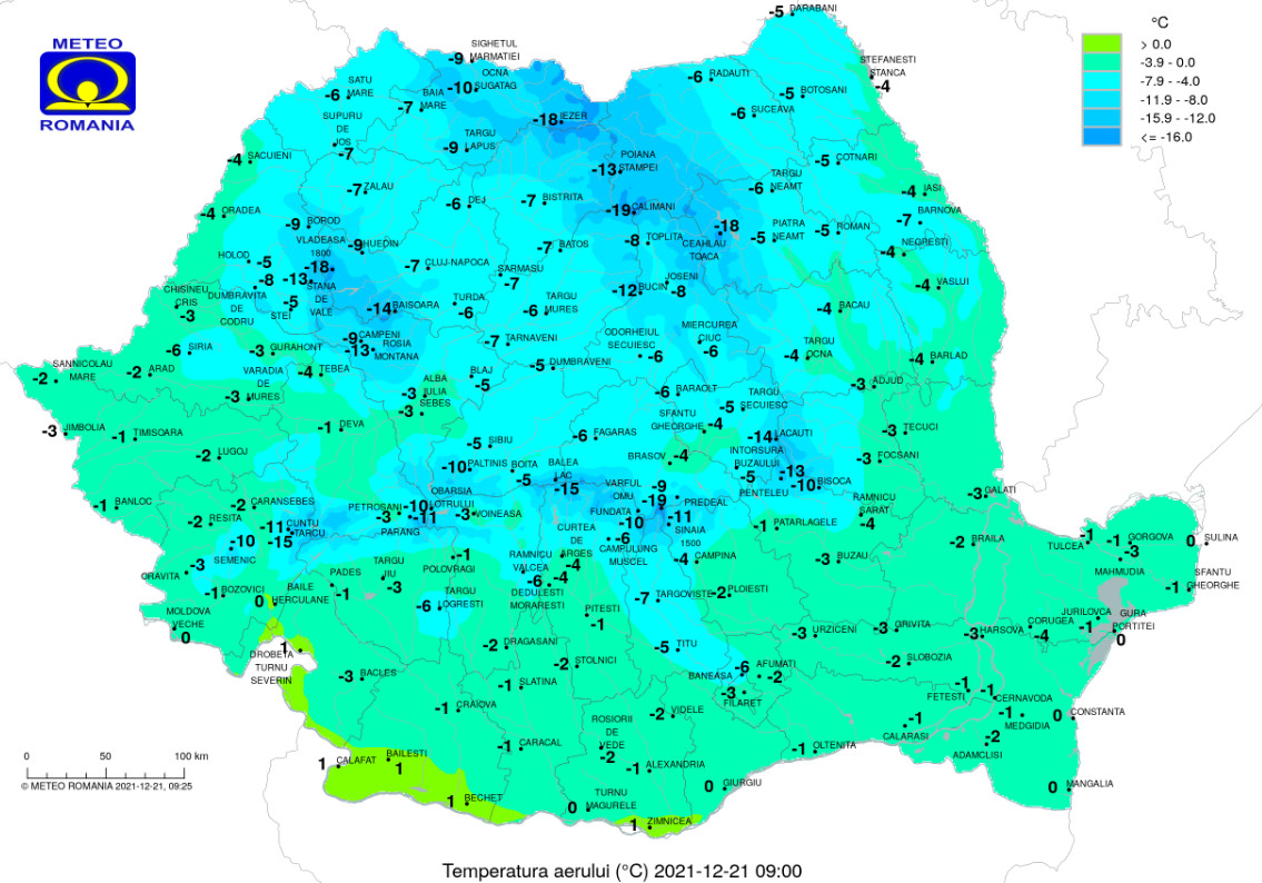 Marți, 21 decembrie, temperaturile maxime se vor încadra între -6 şi 6 grade, valorile termice se vor situa sub cele specifice datei în cea mai mare parte a ţării.