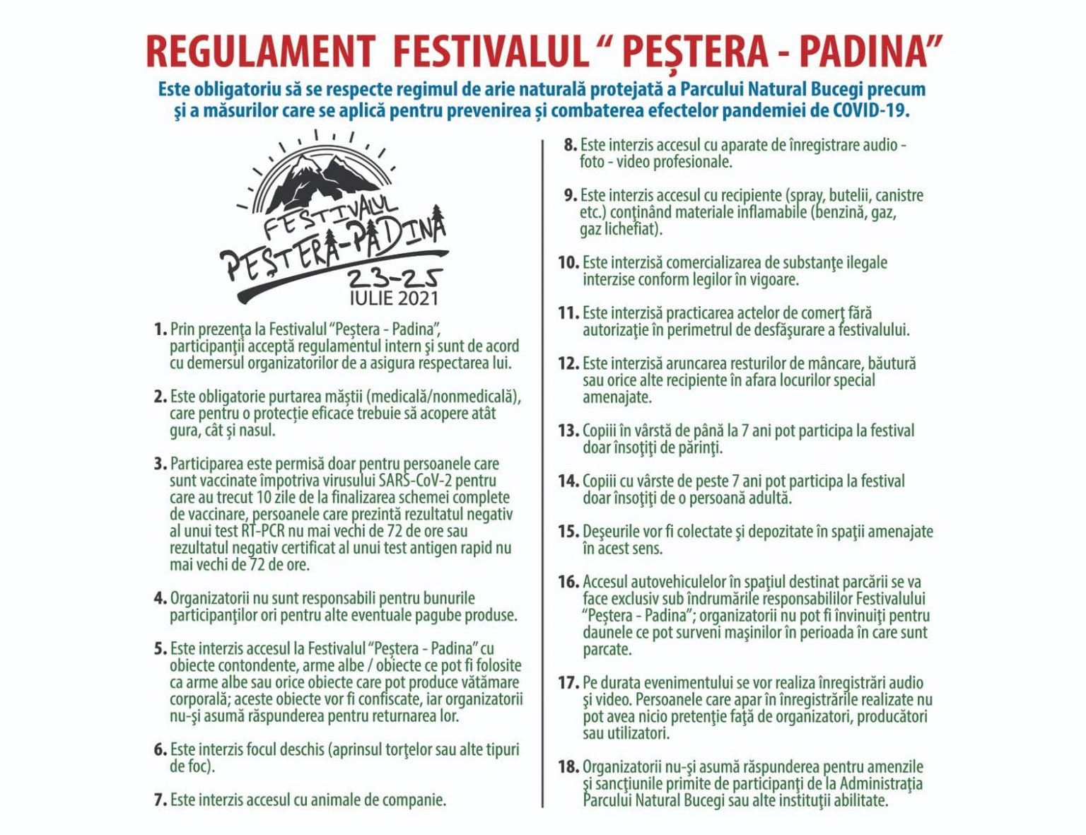 REGULAMENTUL Festivalului „Peștera-Padina”, este stabilit conform organizatorului- Centrul Județean de Cultură Dâmbovița și prevede reguli speciale în contextul pandemiei COVID-19.