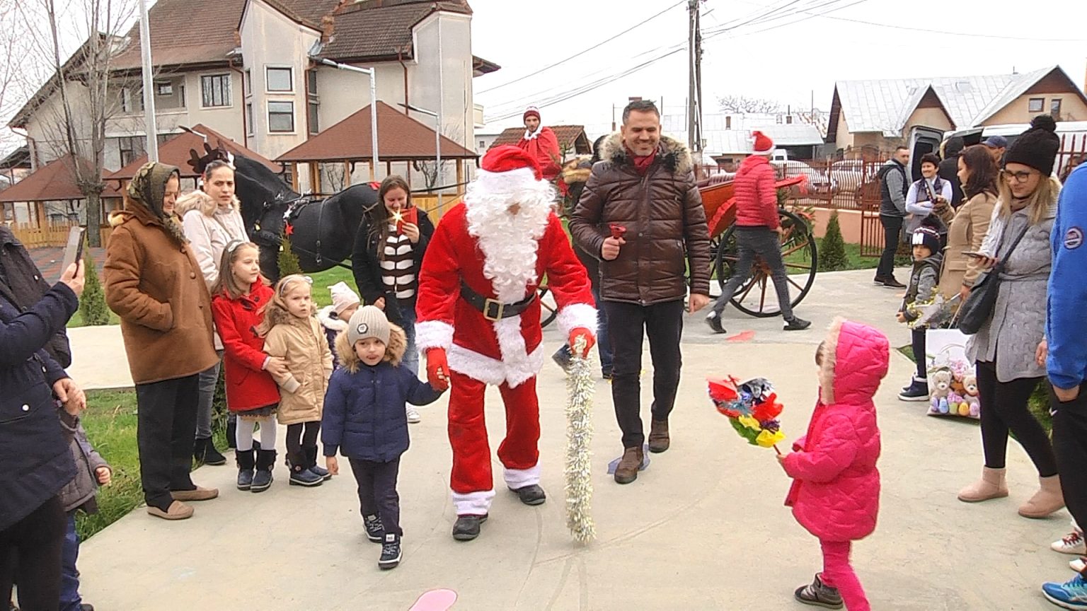Moş Crăciun a fost ajutat de administraţia locală condusă de edilul Gheorghe Sandu, să vină cu sacul încărcat de daruri.