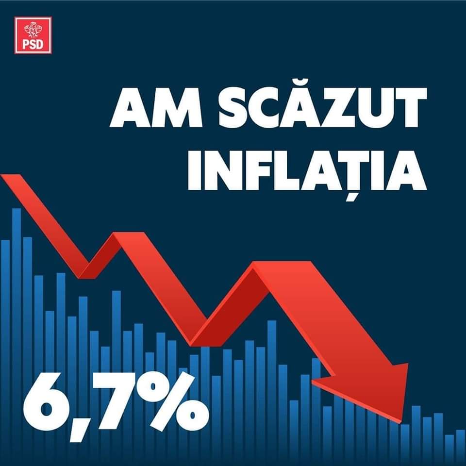 „De la 16,8%, la 6,7% ! Aceasta este evoluția inflației în ultimul an! Când am preluat mandatul de premier am promis că voi lucra împreună cu BNR astfel încât să ducem inflația la o singură cifră până la sfârșitul anului.