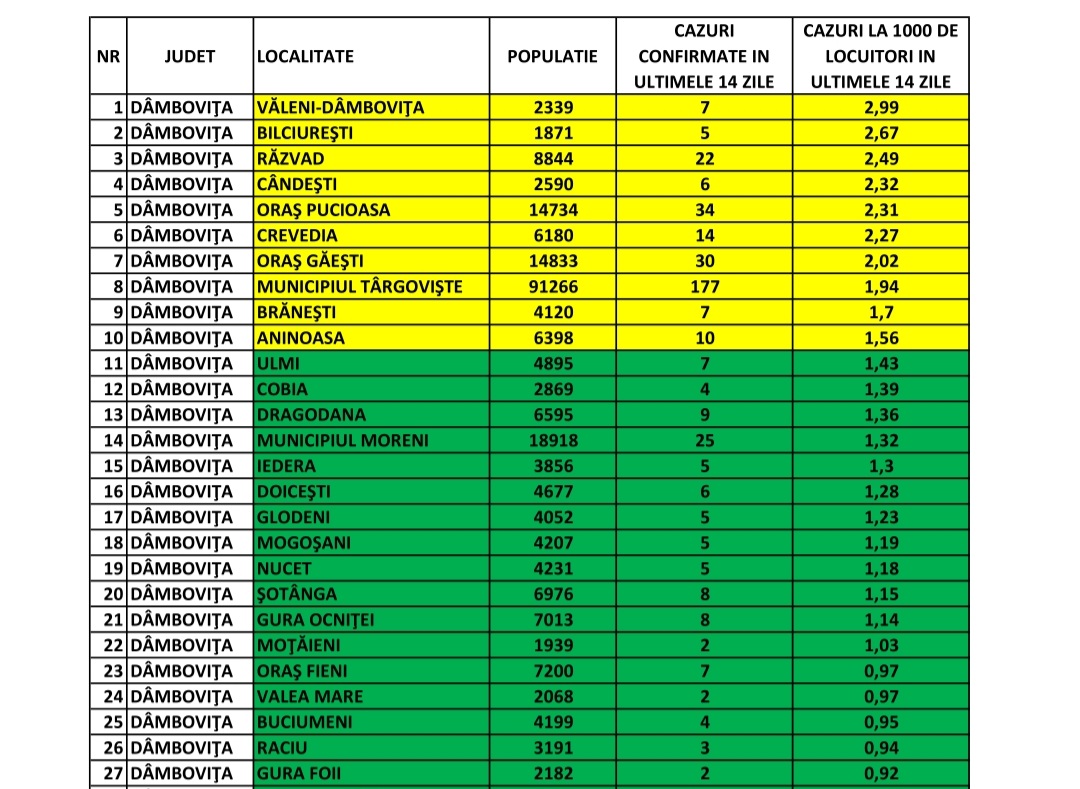 Din cele 89 de localități dâmbovițene, 73 de localități înregistrează cazuri de COVID-19. 10 localități sunt deja în scenariul GALBEN.