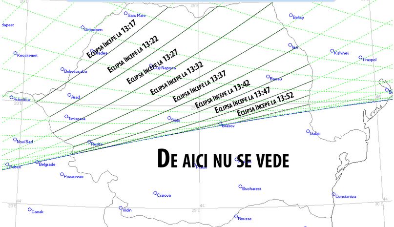 Pentru România eclipsa începe mai devreme în vestul și nord-vestul țării pentru că aceea este direcția din care vine umbra Lunii pe glob. Cel mai devreme eclipsa începe la ora 13:17 (ora României) și cel mai târziu la 14:08, în estul țării.