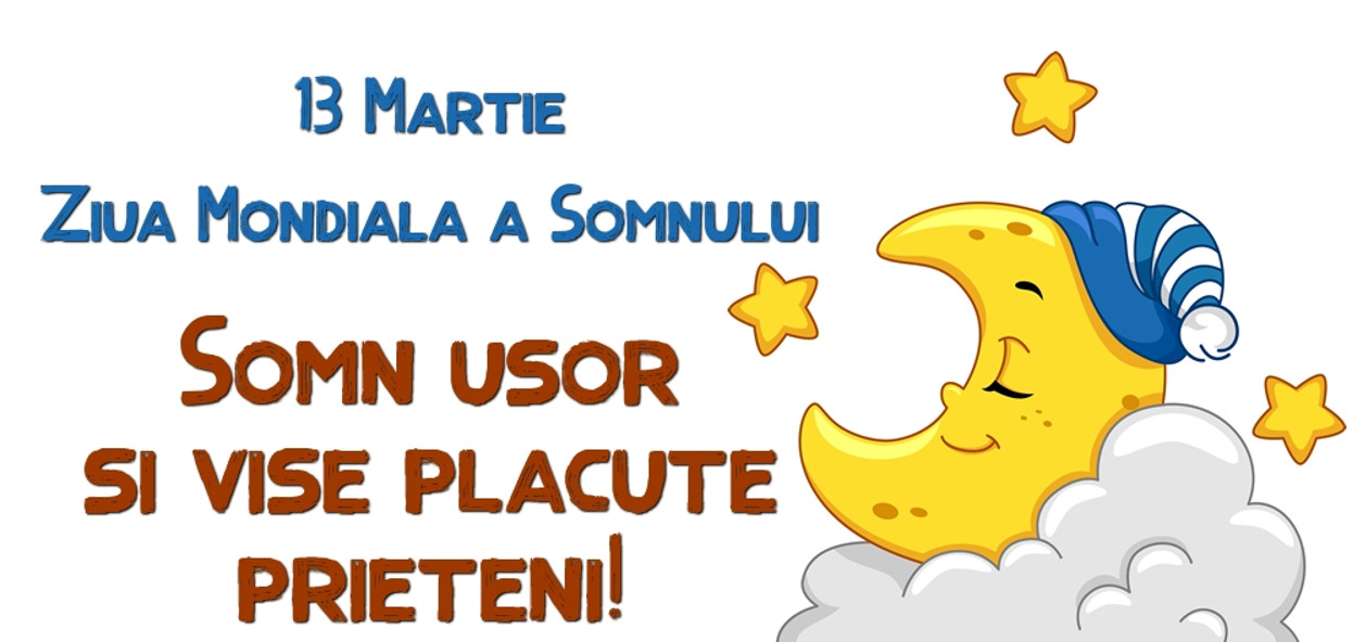 13 MARTIE, Ziua Mondială a SOMNULUI prin care se urmăreşte conştientizarea impactului tulburărilor de somn. Marcată începând cu 2008, Ziua mondială a somnului a devenit un eveniment internațional, axat pe problemele cauzate de insomnie.