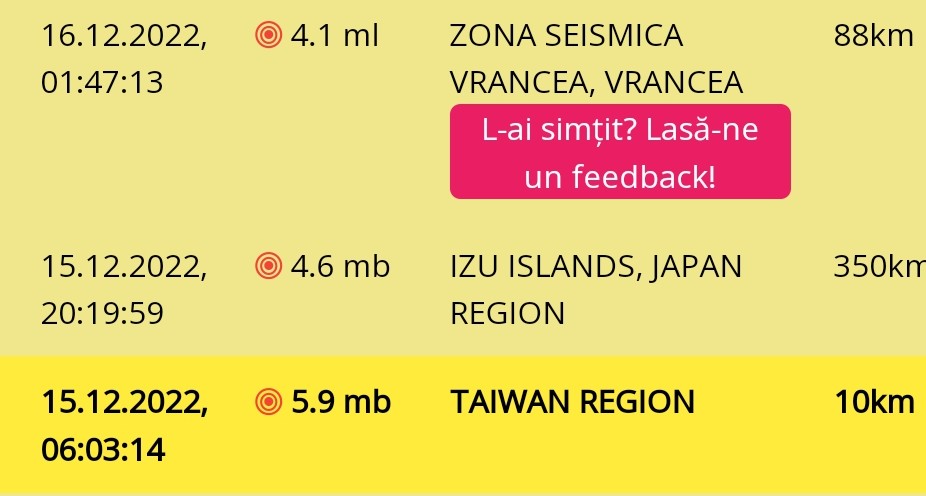 A fost cutremur în noaptea de joi spre vineri, în ziua de 16 Decembrie 2022 la ora 01:47:13 (ora locală a României) s-a produs în ZONA SEISMICA VRANCEA, VRANCEA un cutremur mediu cu magnitudinea ml 4.1, la adâncimea de 88km.