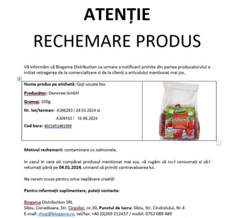Este vorba despre produsul Goji uscate bio, 100 de grame, cu numărul de lot A306283, termen 29.03.2024, și cu numărul de lot A309153, termen 15.06.2024.