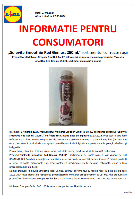 Produsul la care face referire această rechemare conține suc de aronia, care este contaminat cu patulină.