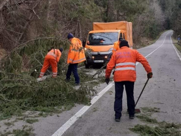 Lucrătorii de la Secția Drumuri Naționale Câmpulung Moldovenesc, au intervenit pentru degajarea carosabilului blocat de arborii doborâți de vântul puternic.