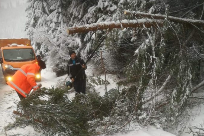 Arbori prăbușiți pe carosabil sub greutatea zăpezii pe DN 15B, extravilan Petru Vodă (jud. Neamț), și pe DN 17B, Crucea (jud. Suceava).