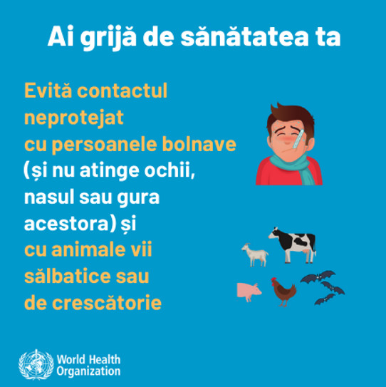 - Evitați atingerea suprafețelor care sunt atinse în mod frecvent și de alte persoane, precum: balustrade, clanțe, mânere, butoane de lift sau de acces.