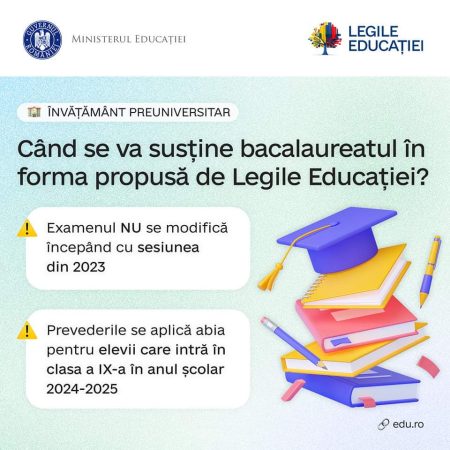 ATENȚIE! NU SE SCHIMBĂ BACALAUREATUL, examenul de bacalaureat se va desfășura în conformitate cu prevederile noii legi începând cu generația de elevi care începe clasa a IX-a în anul școlar 2024–2025.