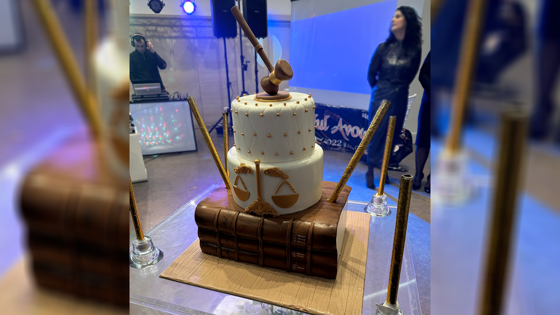 Tortul evenimentului a fost decorat cu două dintre simbolurile justiţiei: balanţa şi ciocănelul dar a mai avut un element în plus, trei dintre volumele „Enciclopedia Juridică Română” la care conf. univ dr. av. Denisa Barbu este coautor, singurul avocat din Baroul Dâmbovița implicat în acest proiect național.