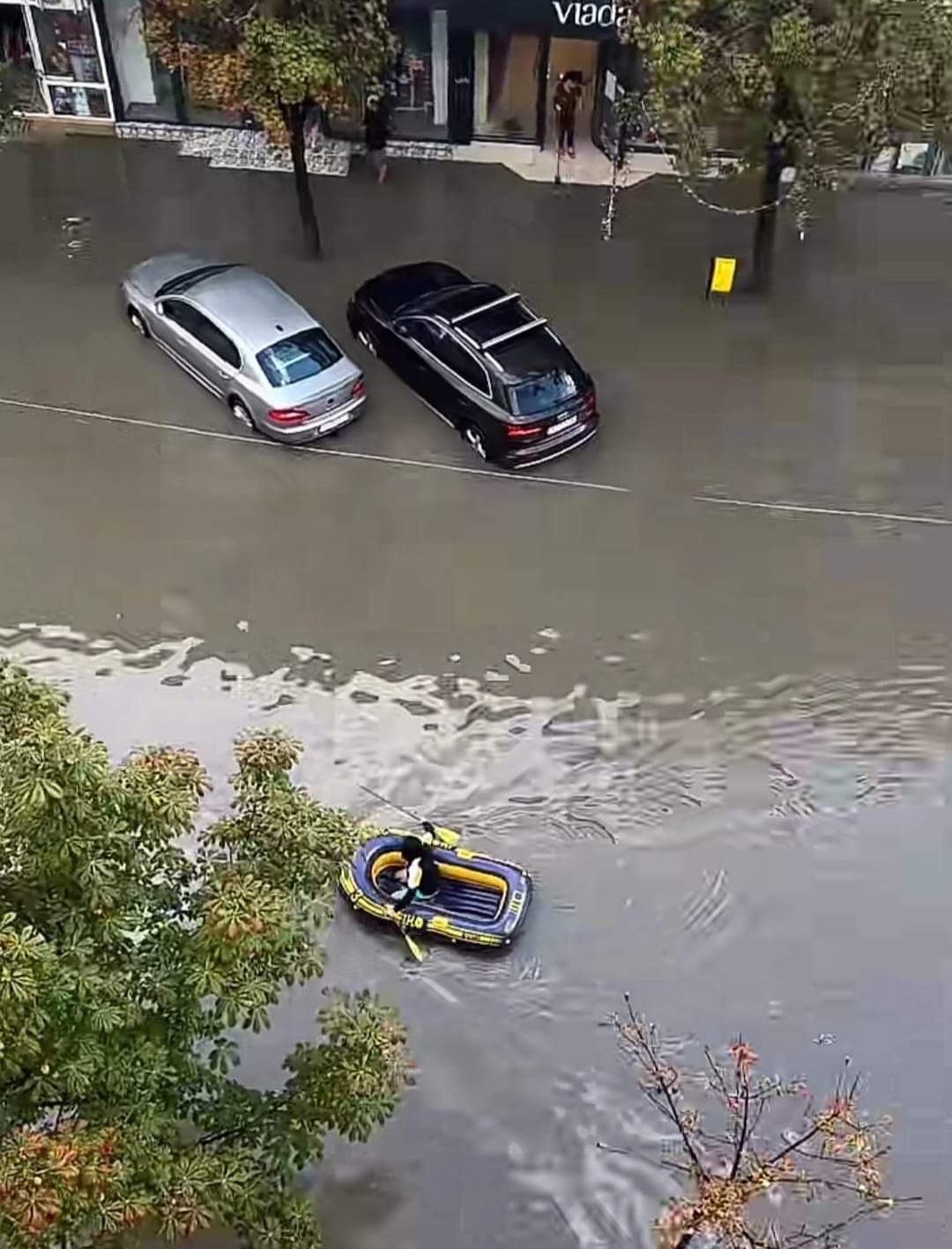 Imaginile surprinse arată cum mașinile și pietonii sunt nevoiți să se deplaseze cu bărcile pe străzile inundate, ilustrând realitatea cruntă a situației.