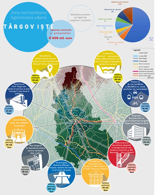 Valoarea estimată a proiectelor menționate este de 606 milioane Euro, dintre care 59% revin proiectelor de drumuri, 10% – infrastructurii de afaceri, 8% – infrastructurii culturale, 8% – infrastructurii de mediu, 5% – infrastructurii sportive, 4% – regenerării urbane, 3% – centrului intermodal și alți 3% – proiectelor de cale ferată.