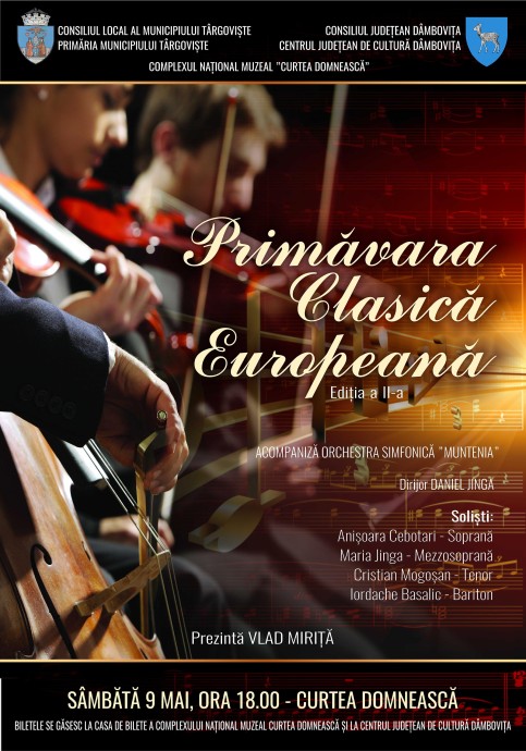 Ziua Europei, 9 mai, va fi sărbătorită şi în acest an la Târgovişte printr-o serie de evenimente de excepţie.Printre acestea se numără Concertul simfonic instrumental „Primăvara Clasică Europeană”. Concertul se află la ediţia a II-a, va avea loc, ca şi anul trecut, în interiorul Curţii Domneşti din Târgovişte şi al Turnului Chindiei şi va oferi şi de această dată târgoviştenilor şi invitaţilor un regal muzical clasic, pe un repertoriu de excepţie. Spectacolul va avea loc pe 9 mai, începând cu ora 18:00.